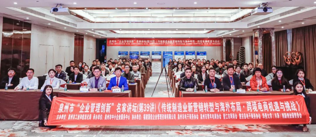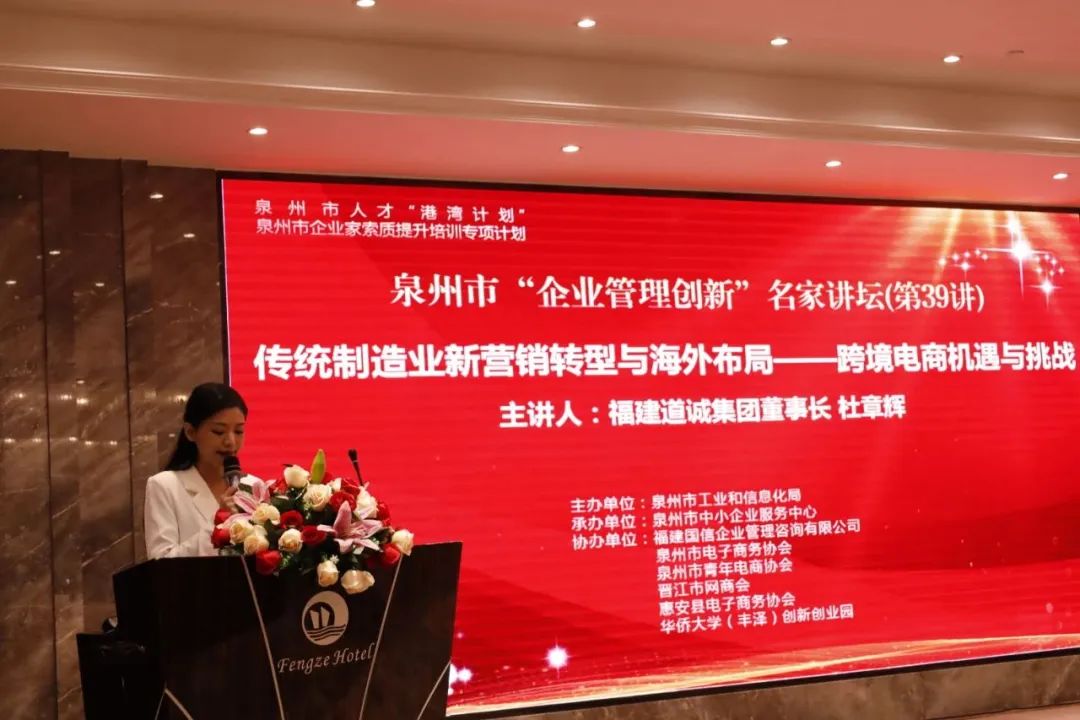 为进一步推进企业自主创新,突破企业管理途径,12月26日下午,由泉州市工业和信息化局主办,泉州市中小企业服务中心承办,福建国信企业管理咨询有限公司、泉州市电子商务协会、泉州市青年电商协会、晋江市网商会、华侨大学(丰泽)创新创业园共同协办的泉州市“企业管理创新”名家讲坛(第三十九讲)在丰泽大酒店成功举行,来自全市龙头企业、优质中小企业及其他工业企业的企业家及高层管理人员等90多人参加了本次活动。福建道诚集团有限公司创始人/董事长兼行政总裁杜章辉先生作为特邀嘉宾,分享内容聚焦于传统制造业在新营销裂变和海外布局方面的创新发展以及跨境电子商务产业的创新趋势,助力企业稳健发。